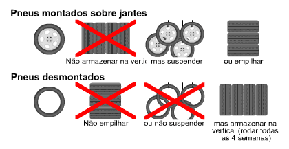 Os pneus devem ser armazenados, se possível suspensos, num local seco e temperado, ao abrigo da luz directa do sol e das intempéries.